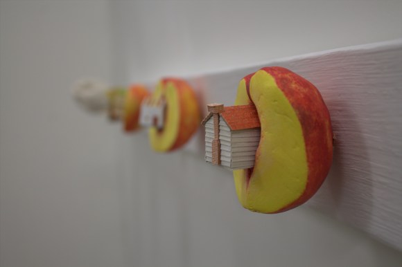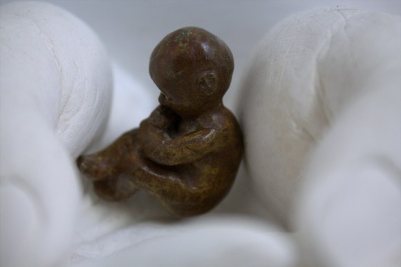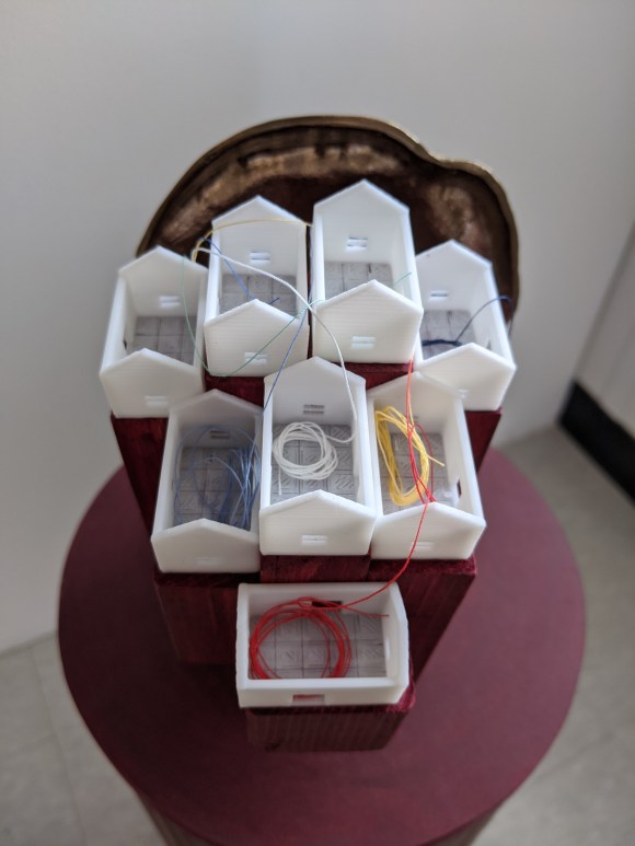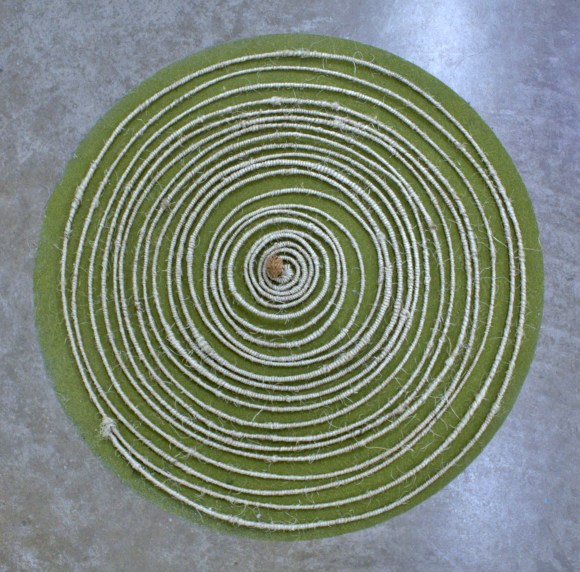 sisal twine, fabric, wire, metal rod, peach pit(?)